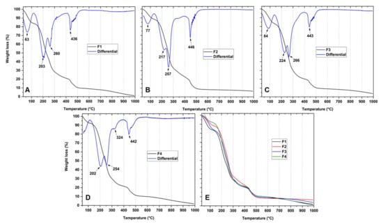 TGA curves of the films. Formulations: F1, (A) (CS/PVA); F2, (B) (CS/PVA/TTEO 0.5%); F3, (C) (CS/PVA/TTEO 1%); F4, (D) (CS/PVA/TTEO 1.5%); (E) all the formulations.