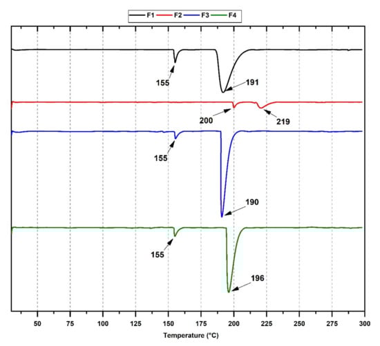 DSC measurements (Figure 3) can provide information on the material’s thermal behavior and phase transitions. Two endothermic peaks can be observed for F1 at 155 and 191 °C, where the endothermic peak at 155 °C can be related to the residual evaporation of the solvent. With the incorporation of 1.0 and 1.5% TTEO (F3 and F4), no significant differences in the temperature are observed in endothermic peaks. However, a narrower and more intense peak might indicate changes in the crystallinity of the structure because of the higher TTEO amount. On the other hand, the peak displacement at higher temperatures when 0.5% TTEO is added to the F2 formulation suggests a significant intramolecular interaction in the film between the better dispersion of the oil components. Chemisorbed water bonds and amino groups of chitosan interact through hydrogen bonds [16,44], with the oil components improving the dispersion through the polymer matrix. That improved dispersion increases the film’s mechanical and thermal properties due to the decreased porosity and increased compaction of the polymeric chains. Similar behavior was observed when α-tocopheryl acetate [45], citronella essential oil, and cedarwood oils [46] were added to chitosan films.