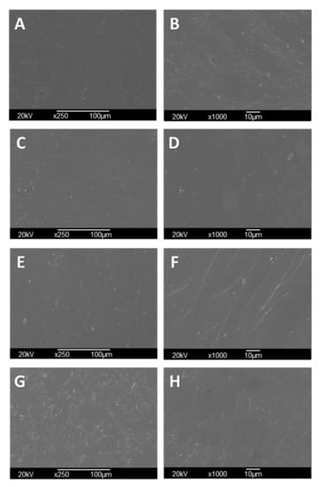 Morphology of CS/PVA/TTEO films by SEM. CS/PVA (F1) (A) at 250×, (B) at 1000×; CS/PVA/TTEO 0.5% (F2) (C) at 250×, (D) at 1000×; CS/PVA/TTEO 1.0% (F3) (E) at 250×, (F) at 1000×; CS/PVA/TTEO 1.5%(F4) (G) at 250×, (H) at 1000×.