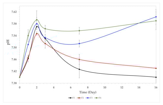 Solution pH variation vs. immersion time in simulated biological fluid. F1, (CS/PVA); F2, (CS/PVA/TTEO 0.5%); F3, (CS/PVA/TTEO 1.0%); F4, (CS/PVA/TTEO 1.5%).