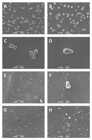On the other hand, irregularities in formulations F3 and F4 (Figure 4E–H) increased with TTEO incorporation due to the reduced mobility of the TTEO drops induced by the highly viscous chitosan solution [47]. In addition, the 1.5% concentration of TTEO showed pearl formation, possibly at the high oil concentration, which facilitates the aggregation of lipids, leading to a flocculation of TTEO in the polymer that occurred during the volatilization of the solvent in the drying process.
