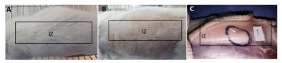 The biomodels were sedated by an intramuscular ketamine 30 mg/kg and Xilacina 70 mg/kg (Xilaxyn-Virbac., Bogotá, Colombia). The level of sedation was verified to perform the trichotomy test on the entire dorsal surface. The dorsal surface was disinfected with iodine solution. Then, lidocaine 2% with epinephrine 1:80,000 (Newcaina, Guarne, Antioquia, Colombia) was applied as a local anesthetic in the implantation zones. After that, using a bard parker scalpel with blade No. 15, six incisions of 10 cm long were made, and six pockets of 3 cm deep were created using a dental periosteal. Finally, five experimental CS/PVA/TTEO films and collagen films (control) were implanted (10 × 5 × 1 mm) films.