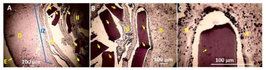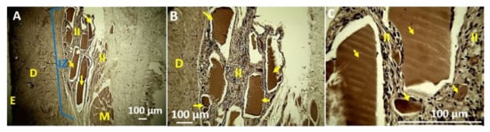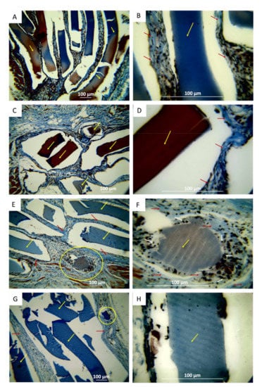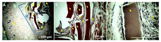 More significant reabsorption is observed with a higher incorporation of TTEO (F3, TTEO 1.0 wt %). Figure 14E shows a small fragment in the process of resorption (area marked with a yellow oval). With a higher magnification (40×, Figure 14F), fragments of cylindrical shape are observed due to the action of the phagocytic cells surrounding it in a centripetal reabsorption process already reported for other materials [9].