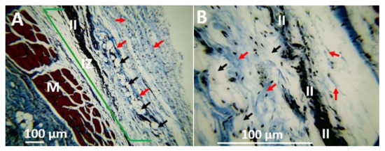Histology of the porcine collagen film 90 days after subdermal implantation. (A) 10×, (B) 40×. IZ: Implantation Zone. II: Inflammatory Infiltrate. The red arrow indicates the presence of collagen fiber. The black arrow indicates the presence of adipocytes.