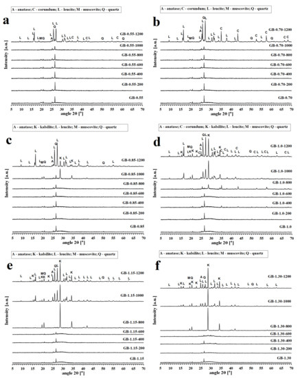 Figure 2. XRD patterns of the geopolymer binders with various molar ratios of K/Al ((a)—GB-0.55, (b)—GB-0.70, (c)—GB-0.85, (d)—-1.0, (e)—GB-1.15, (f)—GB-1.30) at laboratory temperature and after exposure up to 1200 °C.