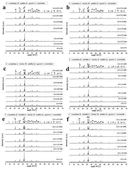 Figure 3. XRD patterns of the geopolymer composites with various molar ratios of K/Al ((a)—GS-0.55, (b)—-0.70, (c)—GS-0.85, (d)—GS-1.0, (e)—GS-1.15, (f)—GS-1.30) at laboratory temperature and after exposure up to 1200 °C.