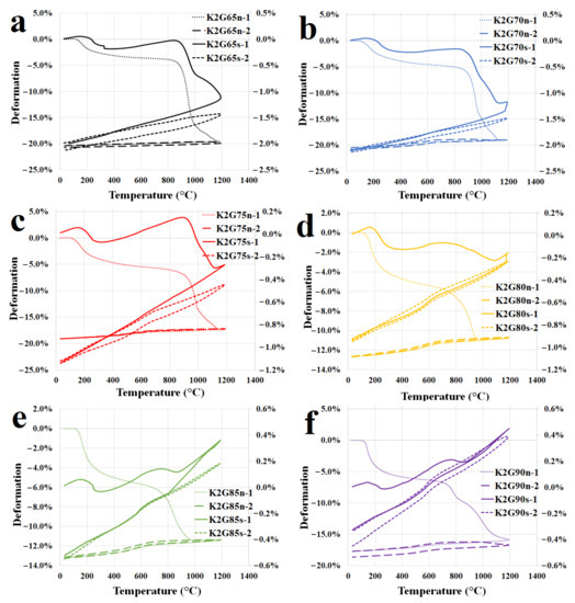 Figure 4. The dilatometric curves of the first and second runs of geopolymer binders (y-axis on the left) and composites (y-axis on the right) with various molar ratios of K/Al ((a)—GB-0.55 and GS-0.55, (b)—GB-0.70 and GS-0.70, (c)—GB-0.85 and GS-0.85, (d)—GB-1.0 and GS-1.0, (e)—GB-1.15 and GS-1.15, (f)—GB-1.30 and GS-1.30) up to 1200 °C (5 °C/min).