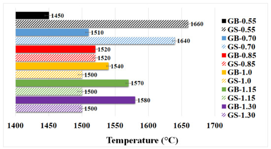 The ability to resist high temperatures (refractoriness) was examined for geopolymer binders and composites with various K/Al molar ratios. The results of these tests are shown in Figure 5. The refractoriness of geopolymer binders increased with increasing K/Al. The temperature difference between the limit samples (GB-0.55 and GB-1.30) was 130 °C. The addition of chamotte aggregate to the geopolymer binders resulted in a decrease in their refractoriness. The reduction in refractory value could be due to earlier sintering of the geopolymer matrix and chamotte or due to the lower melting point of the chamotte filler. The exceptions were samples GS-0.55 (1660 °C) and GS-0.70 (1640 °C), which had a refractory temperature significantly higher than the corresponding geopolymer binders GB-0.55 (1450 °C) and GB-0.70 (1510 °C). These two samples also differed from other geopolymer composites, which had a refractory temperature of around 1500 °C. This phenomenon can be explained by the fact that the samples firstly began to collapse inwardly, instead of starting to fall with the tip of the cone to the base. High values of refractoriness may not be due to high temperature resistance of these samples. The results reveal that almost all prepared samples (except GB-0.55) could withstand high temperatures up to 1500 °C. This was especially true of samples with a K/Al ratio equal to 0.85 or 1.0. The result of refractoriness of GS-1.0 is comparable with the result (1500 °C) of our previous research [15], where GS-1.0 was also tested.