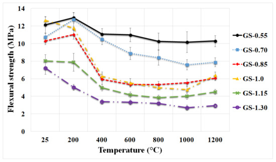 The samples GS-1.0 and GS-0.55 showed the highest flexural strength (12.7 and 12.2 MPa) at laboratory temperature. The samples GS-0.55 and GS-0.70 had a flexural strength of 10.3 and 6.4 MPa after exposure to 1200 °C. The sample GS-0.55 excelled in great stability because the decrease in flexural strength was only 15% between LT and 1200 °C. On the contrary, a higher decrease in flexural strength (50%) between LT and 1200 °C was observed for the GS-1.0 sample. The sample GS-1.30 had flexural strengths of only 7.2 and 2.9 MPa at laboratory temperature and after exposure to 1200 °C. Musil et al. [47] also noticed a decrease in flexural strength with increasing temperature (LT—13 MPa and 1200 °C—3.44 MPa) for potassium geopolymer with addition of chamotte as a filler.