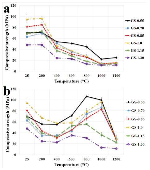 Figure 7b displays the compressive strength of geopolymer composites with varied K/Al measured at temperatures from 25 °C to 1200 °C (in situ). It is evident that compressive strength tested in situ at the required temperature did not show results comparable with compressive strength tested after exposure to an elevated temperature (via Figure 7a). A decrease in compressive strength up to a temperature of 400 °C was also observed with in situ-investigated samples; the drop was caused by the previously mentioned dehydration. From temperatures of 600 to 1000 °C, the samples tested in situ had significantly higher values of compressive strength compared with samples tested after exposure to an elevated temperature. The increase in compressive strength was probably due to the absence of a cooling phase during in situ testing, which can be a source of cracks and increasing plasticity of the geopolymer composite at higher temperatures [15]. Sample GS-1.0 had higher compressive strength values tested in situ at elevated temperatures compared with samples GS-0.70, GS-0.85, GS-1.15, and GS-1.30. Sample GS-0.55 had analogous results to sample GS-1.0. Samples GS-0.55 and GS-1.0 gave exceptional results of compressive strengths (99.9 and 97.1 MPa) at an elevated temperature of 1000 °C.