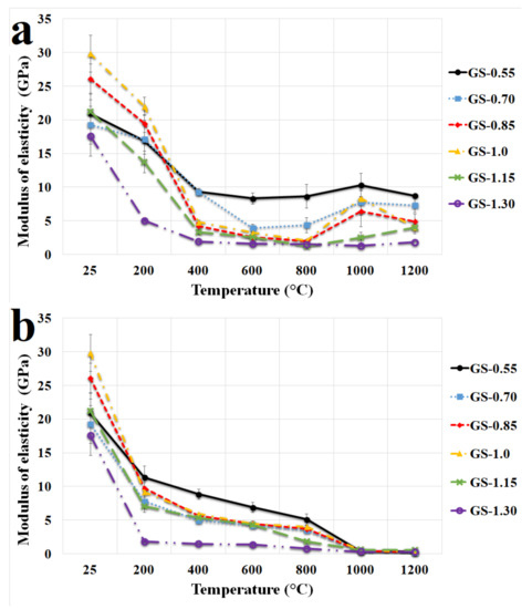 Figure 8a shows the dependences of the modulus of elasticity of geopolymer composites on the K/Al ratio in the binder for different exposure temperatures (ex situ). Curves of modulus of elasticity at different temperatures with different K/Al ratios were very similar to curves of compressive strength (Figure 7a), which meant a reduction in the modulus of elasticity with higher exposure temperatures and analogous behavior depending on the different K/Al ratios. A significant decrease in the modulus of elasticity was observed from a temperature of 200 °C due to dehydration of water from the pores of geopolymer binders. The values of modulus of elasticity first increased and then decreased with rising K/Al ratios. Similar behavior was observed by Zhang et al. [51], who investigated the geopolymer binders with different Si/Al and Na/Al molar ratios prepared from metakaolin. GS-1.0 had a modulus of elasticity 29.9 GPa at laboratory temperature and 4.1 GPa after exposure to 1200 °C. The highest modulus of elasticity after exposure to 1200 °C was with sample GS-0.55, and the value was 8.8 GPa. The modulus of elasticity observed by Zhang et al. [51] was 1 GPa with the sample with an Na/Al ratio equal to one tested at laboratory temperature. The large difference in modulus of elasticity may be due to different used cation, curing conditions, or higher water content.