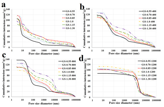 Figure 9. Mercury intrusion porosimetry of the geopolymer composites with various molar ratios of K/Al at laboratory temperature (a) and after exposure to 400 °C (b), 800 °C (c), and 1200 °C (d).