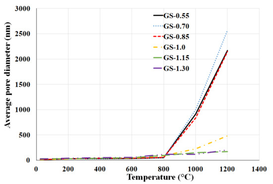 The pore size distributions of geopolymer composites before and after exposure to elevated temperatures of 400, 800, and 1200 °C were characterized by mercury intrusion porosimetry. As shown in Figure 9, characteristic pore size gradually increased with the increase of temperature, especially from a temperature of 800 °C. Geopolymer composites contained mainly mesopores up to 10 nm after curing at laboratory temperature (25 °C). Therefore, the average pore size increased from tens of nanometers to hundreds (samples GS-1.0, GS-1.15, and GS-1.30) or micrometers (samples GS-0.55, GS-0.70, and GS-0.85) after exposure to a temperature of 1200 °C. Pore volume of test samples increased slightly with increasing temperatures up to 800 °C (probably due to dehydroxylation) and then decreased at 1200 °C. Significant changes in porosity from 800 °C were probably caused by crystallization of the new phases which caused the shrinkage of the geopolymer matrix.