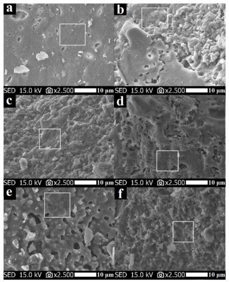 Figure 11. Micrographs of geopolymer binders with various molar ratios of K/Al ((a)—GB-0.55, (b)—GB-0.70, (c)—GB-0.85, (d)—GB-1.0, (e)—GB-1.15, (f)—GB-1.30) at laboratory temperature.