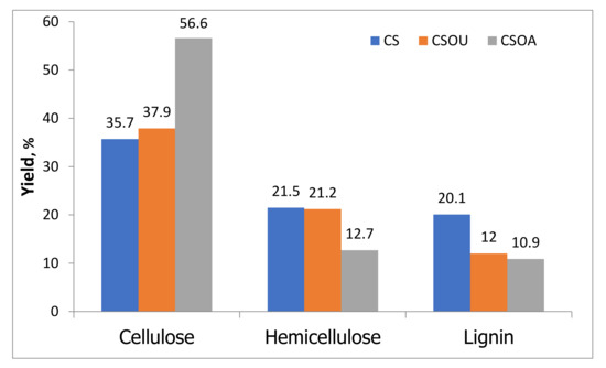 The CS and pretreated solid samples, CSOA and CSOU, were used for determining the solid recovery yield using Equation (1) [21].
