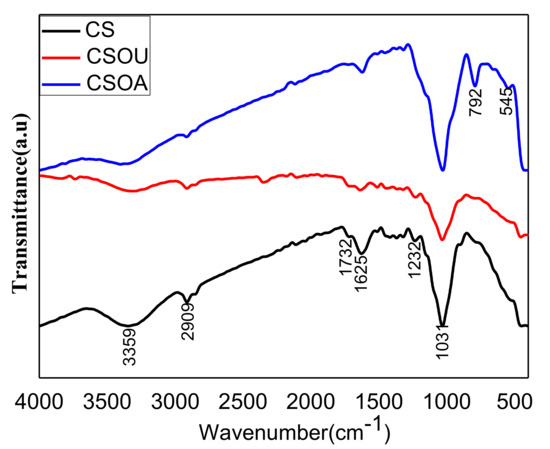 The breaking of bonds and modification in the stretching vibrations related to the structural integrity of lignocellulosic biomass was presented by FTIR spectra. The FTIR spectra of CS before and after physico-chemical pretreatment indicated the structure changing due to the peak shape and intensity change, as shown in Figure 2. All the samples show a band around 3400 and 3300 cm−1 corresponding to O–H symmetric and asymmetric stretching vibration that indicates the presence of alcohols, phenols, and physisorbed and chemisorbed water molecules in cellulose [27,28]. After pretreatments, this peak became broader, indicating more vibrational modes of inter- and intra-molecular hydrogen bonding and lower amounts of OH groups [29]. The peaks at 2913 cm−1 are presented in the three samples and contribute to the aliphatic structures of asymmetrical C–H stretching vibrations in lignin and/or hemicelluloses [30,31]. The intensity of this peak in CS > CSOU > CSOA indicates a significant decrease in the lignin and/or hemicellulose content in the treated samples in comparison with the CS. The peak at 2349cm−1 that appeared in the CSOU sample corresponded with the –OH stretching vibration mode of the hydroxyl functional groups [32,33]. The peak at 1740 cm−1 in the CS sample was related to C=O stretching vibration of either the uronic and acetyl ester groups of the hemicelluloses or the ester linkage of the carboxylic group the ferulic and p-coumaric acids of lignin, pectin, and/or hemicellulose [34,35]. This peak completely vanished after the pretreatment process, indicating efficient removal of most of the lignin and hemicellulose from the CS. The peaks at 1628 cm−1 were related to the C = C aromatic skeletal stretching vibrations and C=O stretching of lignin [36]. The intensity of this peak decreased after the pretreatment process, which indicates that the lignin content was reduced due to a successful delignification process that resulted from C=O to C–OH group transformation. In the CS sample, the peak at 1234.9 cm−1 was related to guaiacyl/syringyl ring and C–O stretching vibration, which indicates the presence of both syringyl and guaiacyl in residual lignin and/or xylan [37]. This peak was shifted to 1230 cm−1 in CSOU sample, which could have been due to C = O absorption that resulted from cleavage of acetyl groups [38]. This peak wholly disappeared in the CSOA, which meant significant removal of lignin. The vibration of the sharp peak at 1031 cm−1 was related to C1-H deformation with ring vibration contribution, C–O and C–C stretching, and C–OH bending in β-(1-4)-glycosidic linkages between glucose and cellulose [29,39]. The intensity of this peak in the CSOA > CS > CSOU indicated a significant increase in the cellulose content after the pretreatment using an autoclave. However, using ultrasonic irradiation potentially led to breaking the cellulose and dissolving it, as occurred with lignin and hemicellulose. This means that pretreatment using autoclave decreased the lignin and hemicellulose effectively without deteriorating the β-(1-4)-glycosidic linkages between glucose and cellulose. Two additional peaks existed in the CSOA sample at 892 and 545 cm−1, attributed to cellulose and C–OH bending, respectively [40]. Therefore, FTIR analysis clearly confirmed the degradation of lignin and hemicellulose due to combined physical and chemical pretreatments.