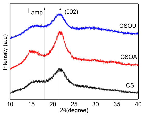 XRD provided more insights into the structural improvement after the pretreatment process, as well as the inter/intramolecular linkage alterations that resulted in cellulose swelling, lignin removal, and enhanced accessibility to enzymes. In Figure 3, the diffraction peak is approximately located at 2θ = 21.69° (002), indicating the existence of cellulose type II [29]. It can be seen that the CrI of the CS was determined to be 45.73%, which subsequently boosted to 56.59% after autoclave-assisted oxalate pretreatment. The increase in CrI was due to a reduction in amorphous fractions, primarily lignin and hemicellulose, which exposed the reactive cellulose. Contrarily, the CrI of CSOU was reduced from 45.73 to 39.5%, which indicates the cleavage of the crystalline structure of cellulose in CS as a result of the ultrasonic irradiation. It is claimed that the autoclaving pretreatment was influential in the depolymerization of amorphous lignin that resulted in a higher percentage of crystalline cellulose, thereby improving the rate of enzymatic saccharification [44]. Hence, it can be deduced that the autoclave-assisted oxalate pretreatment process markedly fractionates the crystallinity of the cellulose.