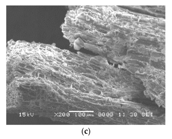 Furthermore, the combination between oxalic acid and the physical pretreatment exhibited uneven surfaces with cavities and cracks, as well as ruptured fibrillary network, due to the successful removal of lignin and hemicellulose amorphous regions from the CS. Moreover, the lignin layer in the case of CSOA (Figure 4c) was disrupted and stripped off with longitudinal cavities more than in the case of CSOU (Figure 4b), leading to higher porosity and partial visibility of cellulose fibers. CS pretreated surface was more open and exposing of the reactive spots of cellulose in order to improve enzymatic accessibility. The drastic ruptures and high roughness of the CSOA surface indicates a significant delignification process [46].