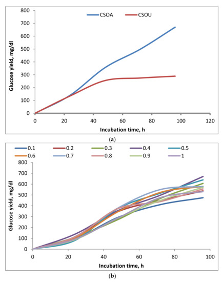 For studying the influence of the enzyme dosage on the glucose production yield, we conducted enzymatic saccharification experiments using the identical amounts of 1:25 g solid substrate/mL sodium acetate buffer at 50 °C and shaking speed 100 rpm with different enzyme dosages as shown in Figure 6b. The substrate used to perform these experiments was CS treated with oxalic acid 2% and autoclave at 120 °C for 1 h with 1:20 solid to liquid ratio. It is clear from the data that glucose production yield increased with the increase in enzyme dosage up to 0.4 g to reach 546.5 mg/dL, then decreased until 0.6 g. Increasing the enzyme dosage to 0.7 g increased the glucose yield again to 528 mg/dL. After that, they the enzyme dosage grew from 0.7 to 1 g and did not significantly increase the glucose production yield. Hence, it can be decided to use 0.4 g of the enzyme dosage for further experiments.