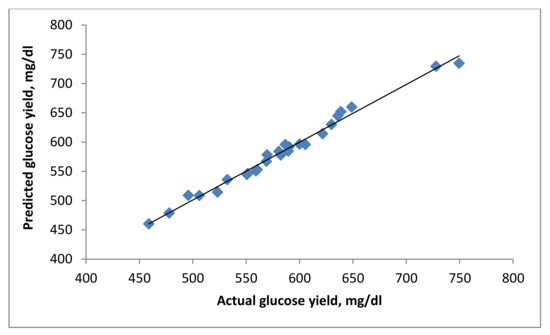 Figure 8. Regression plot between the actual and predicted glucose yield.