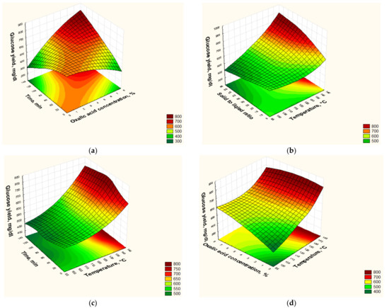The experimental results of the glucose production yield for all experiments were presented as mean (M) ± standard deviation (SD). Calculations of M and SD were carried out using Microsoft Excel. The effect of process variables such as temperature, oxalic acid concentration, contact time, and the solid–liquid ratio on glucose production yield was investigated using the RSM model and CCRD design. These independent variables were selected at five levels, as shown in Table 1.