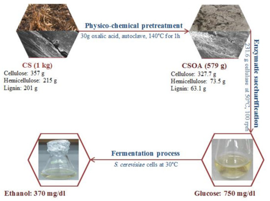 Even though CS has been considered an economical and available lignocellulosic biomass for producing high-value products, including bioethanol, it essentially needs pretreatment conditions to break down its structure and enhance cellulose accessibility for enzymatic saccharification and, consequently, high bioethanol production. Many other researchers have discovered that lignin is a significant inhibitor of enzymatic saccharification in CS instead of other herbaceous plants (such as rice straw), where hemicellulose is the predominant inhibitor.