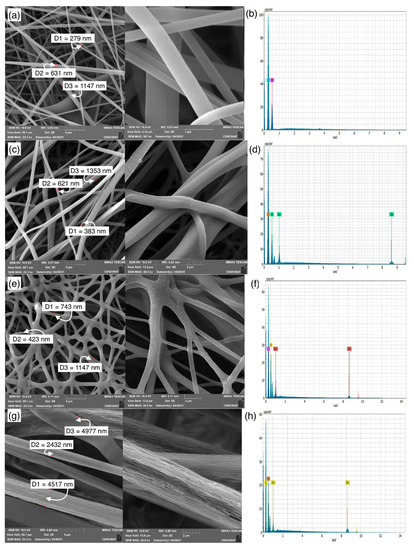 For the ZnO-3/r-PET an interlaced fibrous mat can be observed in Figure 2e. The presence of beads on the surface is notorious, which could represent the ZnO-NPs agglomeration on the surface. When the concentration of ZnO-NPs changed to 6% w/w, roughness is observed on the fiber surface (Figure 2g). The significant variation in the diameter and morphology of the fiber is eventually due to the concentration of ZnO-NPs. Furthermore, an additional experiment was attempted with a concentration of 9% w/w, but this was not achieved due to the high viscosity of the solution. This parameter prevented the passage through the hose that connects the syringe with the metal tip. It should also be taken into account that increasing the polymer concentration leads to the formation of larger fiber diameters [52].