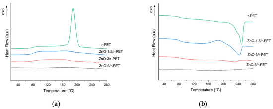 (a) Cooling stage thermogram and (b) second heating stage thermograms of r-PET composite fibers.