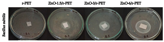 The synthesized ZnO-NPs/r-PET fibers showed profound antibacterial capacity against Escherichia coli and Bacillus subtilis at different ZnO concentrations, which makes these fibers a great alternative to combat Gram-positive and Gram-negative bacteria. The results confirm that the ZnO-NPs were released from the r-PET matrix and diffused with significant amount to the culture medium, forming bacterial inhibitory halos within the expected range according to the previously cited reference. The results obtained open a promising field to replace other bactericide compounds that could cause bacterial resistance. Therefore, the prepared nanocomposite fibers can be used for food packaging or medical applications. However, it should be noted that some studies have indicated a high toxicity of ZnO-NPs to human cells at relatively high concentrations and low particle sizes [69]. Indeed, ZnO has shown properties against intestinal diseases by protecting intestinal cells from Escherichia coli infection by inhibiting bacterial adhesion and internalization [70].