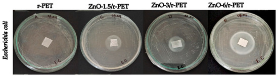 Previous studies have highlighted the use of ZnO nanostructures in different thermoplastic polymers to investigate antimicrobial and antifungal susceptibility [60]. The antimicrobial susceptibility of ZnO-NPs/polyester composite films against Escherichia coli and Staphylococcus aureus bacteria was observed, where control polyester films did not show any zone of inhibition. However, the ZnO-NPs/polyester composite films had antimicrobial activity and the zone of inhibition was clearly visible. The diameter of the inhibition zone was measured and found to increase with increasing ZnO-NPs concentration. The diameter for Escherichia coli was 10, 15.7, 18.2 and 21.2 mm for films loaded with 0.25, 0.50, 0.75 and 1.0 wt% ZnO-NPs, respectively. A similar trend was observed for Staphylococcus aureus with a diameter of 15.2, 18.7, 22.6 and 29.0 mm for the films loaded with 0.25, 0.50, 0.75 and 1.0 wt% ZnO-NPs, respectively. As indicated in this investigation, ZnO-NPs produce reactive oxygen species that cause bacterial wall rupture and thus antimicrobial behavior [61].