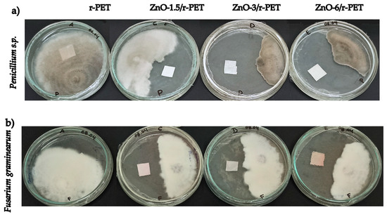 In contrast to the antibacterial analysis, the inhibition halo was not measured during the antifungal test; however, it is possible to observe antifungal properties of the functionalized fibers being evident in Figure 6a,b for Penicillium s.p. and Fusarium graminearum, respectively. A strong fungicidal characteristic is granted, as the concentration of nanoparticles was increased. The highest antifungal effect was observed for ZnO-6/r-PET compared to r-PET, for both fungi. For these results, the research should be continued to elucidate the action of mechanisms of nanoparticles supported into the polymer, as well as to evaluate their potential activity on other pathogenic microorganisms.