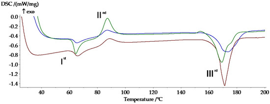 The variation in the heat flow in relation to the recorded temperature for the three phase transformations of each analyzed sample is shown in Figure 1. In order to highlight the possible different thermal compartments of the coated samples, the three signals were overlapped.
