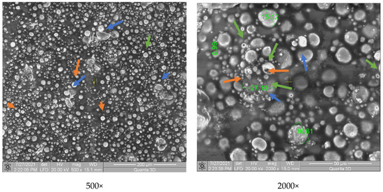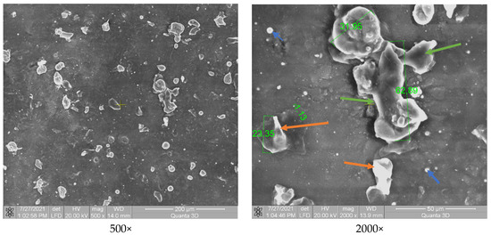 The coating of chromium oxide, silicon oxide and titanium oxide (Cr2O3-xSiO2-yTiO2, Figure 5) highlights a relatively uneven distribution of microparticles, similar to the situation presented in Figure 4. The particles are of different shapes with mostly polyhedral appearance (TiO2—green arrow) but there are also spherical (SiO2—blue arrow) and rectangular (Cr2O3—orange arrow) structures, their dimensions varying between 1 and 63 µm. The particles are embedded in the polymer mass. Both Figure 4 and Figure 5 show chromium oxide, and this compound does not have a better adhesion compared to the sample coated with P3–143–9 passes (Figure 3), which does not contain chromium oxide.