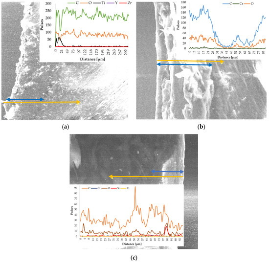 For the sample covered with Zirconia–Titania–Yttria Composite Powder (Figure 6a), the presence of ceramic microparticles in the first 20 µm is observed, an area that we consider to coincide with the thickness of the deposited ±0.02 ceramic layer (blue arrow). Titanium is the chemical element found in the most significant amount in the area of the ceramic layer, but the other two elements are highlighted by the graphic. The presence of a small amount of Zr and Ti during the entire test distance is due to the microparticles that came off of the brittle ceramic layer in the moment of EDX preparation. The higher amount of carbon than oxygen is attributed to the carbides that form during the embedding of molten microparticles in the solid (cold) polymeric matrix, carbides that provide surface hardness. Oxides are also formed but in a much smaller amount.