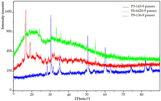 Figure 7 shows the phase diffractograms for the three samples with distinct ceramic coatings: P3–143–9 passes, P6–6420–9 passes and P9–136–9 passes. It can be seen that two of the three samples have a crystalline structure (P3–143–9 passes, P9–136–9 passes) highlighted by specific peaks, and the third (P6–6420–9 passes green diffractogram) has a semi- crystalline structure with the presence of small peaks of chromium oxide at four distinct 2θ angles, 24.25°, 33.39°, 35.88° and 54.61°, respectively, of low intensity, 1036 to 1356 [47,48,49]. The major peak registered at 16.73°, with a diffraction intensity of 2643, which, according to the literature, may be associated with the presence of polylactic acid in its the chemical composition ((C3H4O2)n) [50,51]. The presence of this compound is not accidental because it is due to the fact that the thickness of the deposited layer is very thin (small microparticles), thus, the equipment is detecting one of the basic material constituents.