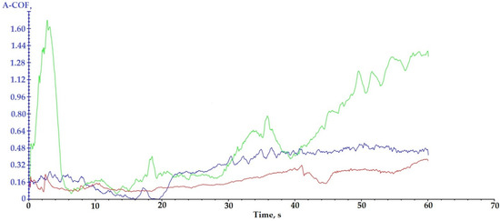 For the P6–6420–9 passes sample, a high amplitude peak of A-COF is registered at the beginning of the test; the explanation for this would be related to the deposition granulation. It is very possible that the tip of the cutting tool (pin) has hung an area of deposited material with a larger granulation.
