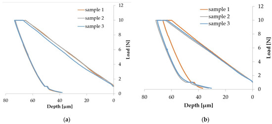 - Scratch analysis: a blade with a tip of 0.4 mm (radius at the tip) was used, the samples were fixed on the table and during the test samples were pressed with a vertical force of 10 N NVIDIA blade, moving the table over a distance of 10 mm in 60 s, and the test speed was 0.167 mm/s. The software performed the automatic test and recorded the following parameters: vertical force Fz, horizontal force Fx, time and distance of movement in the horizontal direction Y (of the fixing mass of the sample).