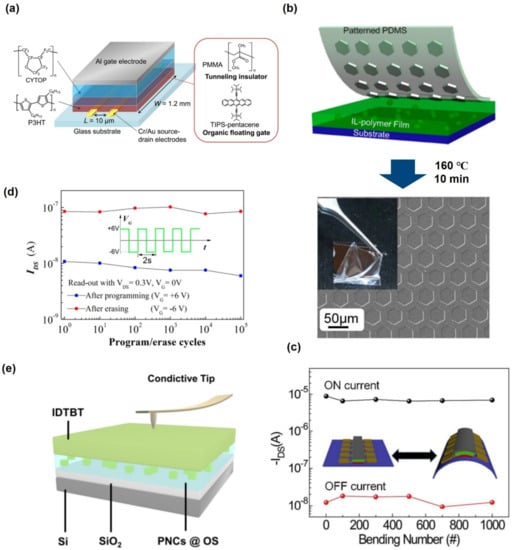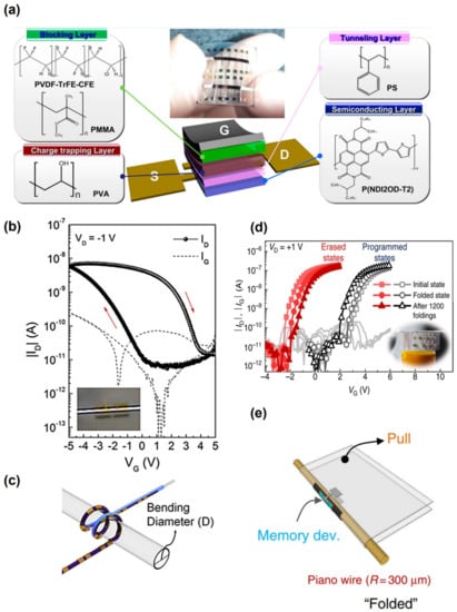 - Lee, S.; Seong, H.; Im, S.G.; Moon, H.; Yoo, S. Organic flash memory on various flexible substrates for foldable, disposable electronics. Nat. Commun. 2017, 8, 725. [Google Scholar] [CrossRef] [PubMed] [Green Version]