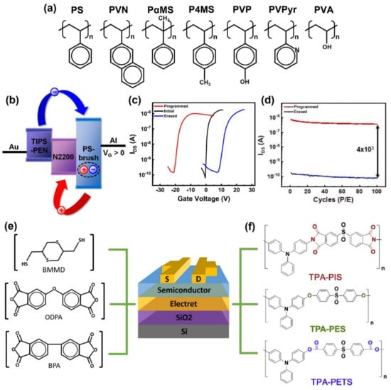 Similar to the operation of a floating gate, a polymer electret memory was also considered as another charge trapping memory. Polymer electret, which is a dielectric material with a quasi-permanent electrical charge, has been used widely in sensors, memories, and gas filters [53,54]. The memory device operates the storage of charges in the polymer electret layer. The following mechanisms can explain the storage of charges in the polymer electrets: orientation of permanent dipoles (in polar materials) and charge-trapping by structural defects or boundaries [55]. Kim et al. reported the properties of various polymer electrets based on styrene [55]. Polymer electret OFET memory implementations using styrene-based polymers, such as polystyrene (PS), poly(α-methylstyrene) (PaMS), poly(4-methyl styrene) (P4MS), poly(2-vinyl naphthalene) (PVN), poly(4-vinyl phenol) (PVP), poly(2-vinyl pyridine) (PVPyr), and polyvinyl alcohol (PVA), were performed (Figure 3a). Organic field-effect transistor devices using hydrophobic and non-polar polymers (PS, PaMS, and PVN) had better non-volatile memory properties than hydrophilic and polar polymers (PVA, PVP, and PVPyr). This phenomenon can be explained by that polar and hydrophilic polymer electrets were difficult to store electric charges because the trapped electrons were released rapidly by dipoles, moisture in the atmosphere, and ions frequently present in the hydrophilic polymer.