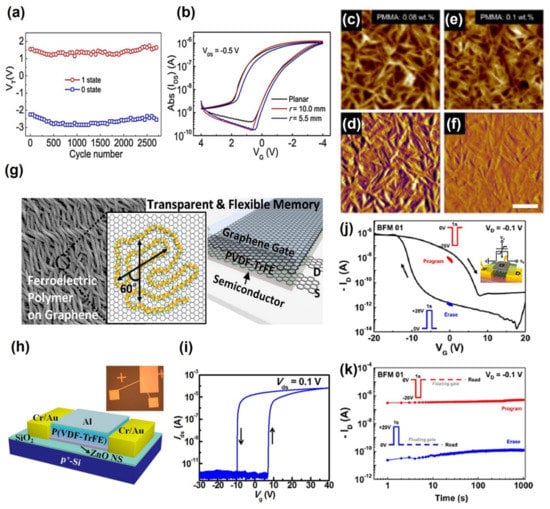 (a,b) Stable data storage retention over 8 × 104 s with a memory 102 of on-off in P(VDF-TrFE-CTFE) ferroelectric FETs (adapted from [84] with permission from Nature). (c–f) RMS roughness of the PMMA/P(VDF-TrFE) surface with increasing PMMA concentration from 0.08 wt. % to 0.1 wt. % (adapted from [86] with permission from the American Chemical Society). (g) Ferroelectric FETs using 2D materials; graphene (adapted from [87] with permission from the American Chemical Society) and (j,k) black phosphorus (BP) (adapted from [88] with permission from the American Chemical Society). (h,i) Structural and I–V characteristic curve of ferroelectric FETs using metal oxide (ZnO) (adapted from [89] with permission from AIP Publishing).