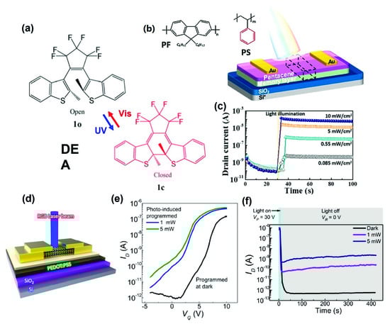 - Carroli, M.; Dixon, A.G.; Herder, M.; Pavlica, E.; Hecht, S.; Bratina, G.; Orgiu, E.; Samorì, P. Multiresponsive nonvolatile memories based on optically switchable ferroelectric organic field-effect transistors. Adv. Mater. 2021, 33, 2007965. [Google Scholar] [CrossRef]