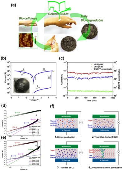 - Wu, W.; Han, S.-T.; Venkatesh, S.; Sun, Q.; Peng, H.; Zhou, Y.; Yeung, C.; Li, R.K.; Roy, V. Biodegradable skin-inspired nonvolatile resistive switching memory based on gold nanoparticles embedded alkali lignin. Org. Electron. 2018, 59, 382–388. [Google Scholar] [CrossRef]