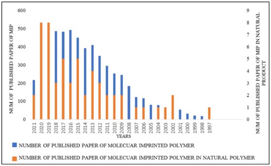To prepare MIPs, a functional monomer and crosslinker in the presence of a template are utilized. The template-monomer system is chosen so that the imprint molecule is able to forms a complex in solution with numerous functional monomers. The resulting imprints have steric (size and shape) and chemical (spatial arrangement of complementary functionality) memory of the template. These imprints enable the polymer to selectively rebind the imprint molecule from a mixture after removing the imprint molecules. In this regard, MIPs with template recognition site of natural products are also a useful method for identifying and extracting natural compounds. MIP-related research in the field of natural products has increased in recent years, as shown in Figure 1. Some examples of MIP applications in the field of natural material analysis have been described below.