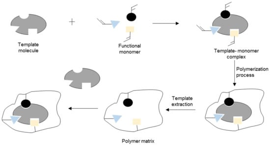 MIPs has a presence of specific recognition regions in the polymer net formed through template-tailored synthesis hence, MIPs are characterized by their selectivity and specificity. There are three stages to this synthetic process. First, the pre-polymerization structure or complex is formed from functional monomers and the templated molecule in the presence of an appropriate solvent. It is a crucial stage, since it determines the formation of the specific recognition regions responsible for the imprinted materials selectivity. In the case of MIPs, this step can be completed either by the covalent or non-covalent approaches, which differ in the type of interactions formed between the template and monomers. The covalent approach is executed via the formation of chemical bonds and, as a result, a new pre-polymerization compound is obtained. In the non-covalently formed pre-polymerization complex, weak molecular interactions. The following step of the imprinting process comprises of a polymerization reaction, usually in the presence of a cross-linker, to fix the pre-polymerization structure and form a polymeric matrix with the specific recognition regions and the template inside of them. In the last stage, the template is removed from the polymer by physicochemical processes, such as hydrolysis reaction (in the covalent approach) or desorption (in the non-covalent approach), yielding a highly cross-linked polymeric matrix with three-dimensional specific recognition regions complementary in term of the molecular volume and geometry of chemical functionalities to the imprinted entity. Those regions are able to adsorb/desorb the template molecule [].