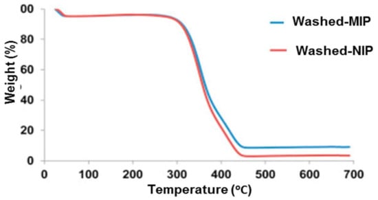 The stability of polymer of bulk polymerization method characterized by TGA was discuss by Cantarella et al. [] to synthesis of MIPs by remove drugs from water. In this study, TG and DTG curves of the MIP indicate the beginning of decomposition at 211 °C and the maximum degradation rate temperature (MRDT) at ~390 °C, with a shoulder placed at approximately 300 °C. The residue level in the MIP sample was low, whereas the degradation at approximately 82 °C indicates residual CH3CN. The NIP’s TG and DTG curves were also observed and compared with the MIP. The thermal profile showed a slightly higher decomposition temperature (~400 °C) compared to the other shoulders due to the various decomposition stages. The MIP’s MRDT reading suggests that DCF molecules influenced the polymerization reaction, resulting in a lower molecular weight (MW). From this, it can reasonably be assumed that a decrease in MW causes a shift in the thermal profile towards lower temperatures, resulting in shoulders overlapping. Apart from that, Zunngu et al. [] produced a selective MIP for ketoprofen shows the decomposition of MIP and NIP at ~290 °C (see Figure 10) designated as the temperature at which the polymer backbone collapses. The polymers lost about 4% of their mass when heated to 40 °C, with the adsorbed methanol utilized in the template removal stage most likely the cause of this loss.