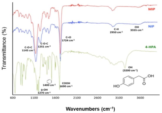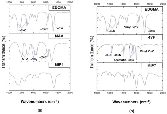 In BET characterization, He et al. [] shows that the MIP had a specific area of 283.92 m2 g−1, whereas the NIP had a specific area of 253.34 m2 g−1. The template’s binding force with the function monomer may have forced the MIPMs to be tighter and smaller, resulting in a more significant specific area and tremendous adsorption advantage over the NIPMs. The surface of the MIPMs had denser and more uniform micropores than the NIPMs. Furthermore, the presence of a template was thought to have an impact on the polymer morphology. As such, the MIPMs’ uniform and open structure made it easier to remove and embed the target molecule compared to NIPMs.