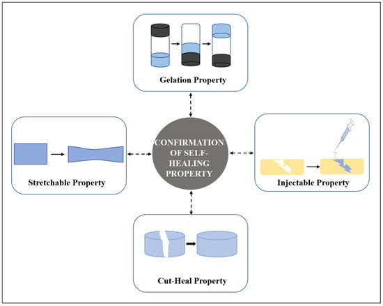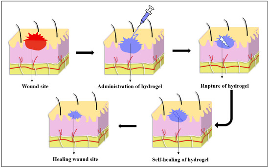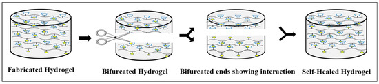 After mechanical damage, self-healing hydrogels spontaneously regenerate through dynamic covalent cross-linkages, covalent, and non-covalent interactions. Thus, the idea of self-healing hydrogels aroused interest, inspired by natural organisms where the function of self-healed material could be maintained by inducing it through external stimuli or interactions that have been discussed in detail so far [4]. As these self-healing hydrogels has the ability to repair itself, it exhibits a prolonged life span even after being exposed to external forces [5]. As a result, self-healing hydrogel is always accompanied by injectability, which reduces comfort and pain while maintaining the wound in its natural state and extending the life span of the dressing material [6]. These self-healing hydrogels called “smart hydrogels” have the capability of automatically repairing themselves either completely or partially after damage (Figure 1). This feature has piqued interest towards its application in biomedical research because it has the potential to extend the longevity of biomaterials while also retaining their original properties, thereby being cost effective [7]. Furthermore, it can improve the material’s reliability and safety in specific applications by preventing failures caused due to wear and tear [8]. This results in its wide variety of applications in biomedical sectors, including drug delivery systems, tissue engineering, and wound healing [9].