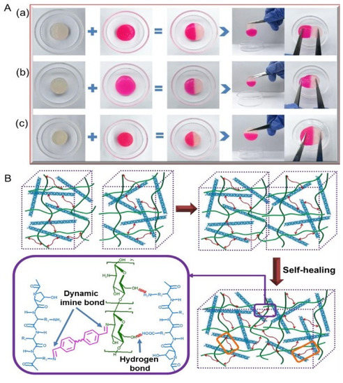 Imine bonds (i.e., Schiff base) are a promising class of dynamic covalent interaction that develops self-healing hydrogels by the formation of crosslinking among amine groups and aldehyde or ketone groups of polymers under physiological conditions [43,44]. The formation of Schiff base has greater reaction speed under mild conditions, ready gelation and heal ability, taking it forward for tissue engineering applications [45,46]. In addition, dibenzaldehyde-modified PFG2000, a modified PEG that acts as a telechelic crosslinker, has been used in the fabrication of a hybrid collagen chitosan hydrogel that revealed dynamic self-healing capabilities within 15 min of crack formation and entirely vanished within 45 min [47] (Figure 3).