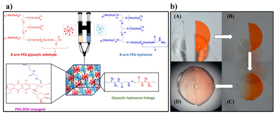 Synthetic polymers are advantageous in terms of their highly controlled synthetic and processing procedure when compared to natural polymers, which suffer from their inherent batch-to-batch variations. Dox is again the most widely explored drug in terms of synthetic polymers based self-healing hydrogels. NIR/thermo-responsive self-healing hydrogel system comprising of polydopamine nanoparticles (PDA NPs) was developed. The self-healing hydrogels are made through dynamic covalent enamine bonds between the amino groups in polyetherimide (PEI) and the acetoacetate groups of the four-armed star-shaped poly(2-(dimethylamino) ethyl methacrylate-co-2-hydroxyethyl methacrylate) modified with tert-butyl acetoacetate (t-BAA), SP(DMAEMA-co-HEMA-AA) and PDA NPs. The injectable hydrogel upon intra-tumoral injections within 4T1 tumor in a mouse model showed improved Dox delivery within the tumor region as well as reduced adverse effects [138]. On similar lines, a self-healing hydrogel was synthesized through cross-linking reaction between 8-arm PEG glyoxylic aldehyde and 8-arm PEG hydrazine using glyoxylic hydrazone linkages, which is shown in Figure 9. Dox was covalently linked to the 8-arm PEG hydrazine in sub-stoichiometric ratios precedent to the hydrogel fabrication. A pH dependent enhanced release of Dox was observed in tumor pH condition when compared to physiological pH [139].