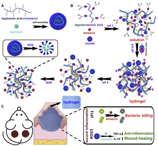 Self-healing hydrogels are typically administered as injectable hydrogels, which could be squeezed while injecting them due to its shear-thinning property and get gelled upon reaching the target site. Furthermore, the lifespan of the hydrogel can be enhanced owing to its self-healing property, which repairs the damaged region quickly without the need for frequent administration. Recently, an inflammation region responsive self-healing hydrogel system comprising of antibiotic amikacin and micelles loaded with anti-inflammatory drug naproxen was reported, as shown in Figure 10. The hydrogel is made by grafting phenylboronic acid to the side chain of the alginate, resulting in a smart pH and reactive oxygen species (ROS)-responsive injectable hydrogel. The hydrogel is found to be biocompatible, showed good antibacterial and anti-inflammatory properties [152].